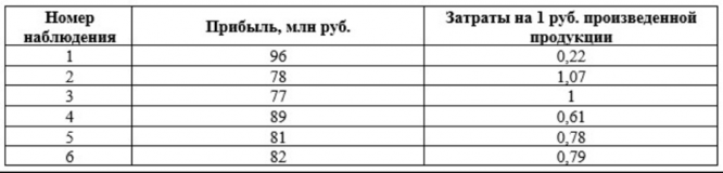 Были получены выборочные данные о деятельности шести коммерческих фирм. На основании полученных данных оцените тесноту связи между прибылью (млн руб.) и затратами на 1 руб. произведенной продукции.