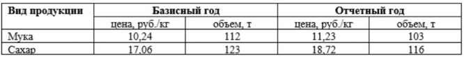 Имеются данные об объемах и ценах продажи продовольственных товаров: