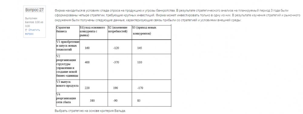 Ответ на вопрос №21558: Фирма находиться в условиях спада спроса на продукцию и угрозы банкротства. В результате стратегического анализа на планируемый период 3 года были сформированы четыре стратегии, требующие крупных инвестиций. Фирма может инвестировать только в одну из них. В результате изучения стратегий и рыночного окружения были получены следующие данные, характеризующие связь прибыли со стратегией и условиямиФирма находиться в условиях спада спроса на продукцию и угрозы - Ответ на вопрос №21558Фирма находиться в условиях спада спроса на продукцию и угрозы - Ответ на вопрос №21558