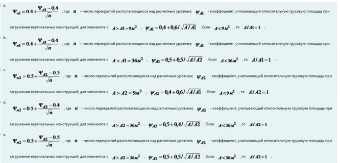 - Ψₙ₁ = 0.4 + (ΨA₁–0.4)/√n , где n – число перекрытий располагающихся над расчетным уровнем; ψA₁ - коэффициент, учитывающий относительную грузовую площадь при загружении вертикальных конструкций; для элементов с A > A1 = 9м², ψA₁ = 0,4 + 0,6/√A/A1. Если A < 9м², то A/A1 = 1 .