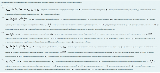 - TR = Qk·hэт·υ/b ≤ 2·Rtω·AR/3 , где AR – площадь сечения надпроёмной перемычки; где Rtω – расчетное сопротивление горизонтального шва кладки на главное растягивающее напряжение; b расстояние между осями наружных стен с противоположных фасадов; υ – параметр неравномерности касательных напряжений в кладке поперечной стены; υ = S₀·b/I – коэффициент неравномерности касательных напряжений, допускается принимать υ =1.15 – для двутавровых расчетных сечений; υ =1.35 – для тавровых расчетных сечений; υ =1.5 – для прямоугольных расчетных сечений; S₀ - статический момент части расчетного сечения консоли расположенной с одной стороны от нейтральной оси сечения 0-0, вычисленный относительно этой оси.