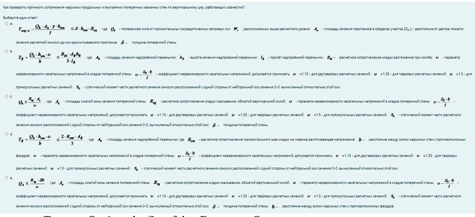- TR = Qk·hэт·υ/b ≤ Rtb·ARhR / 3·lR , где AR – площадь сечения надпроёмной перемычки; hR – высота сечения надпроемной перемычки; lR – пролёт надпроёмной перемычки; Rtb – расчетное сопротивление кладки растяжению при изгибе; υ – параметр неравномерности касательных напряжений в кладке поперечной стены; υ = S₀·b/I – коэффициент неравномерности касательных напряжений, допускается принимать υ =1.15 – для двутавровых расчетных сечений; υ =1.35 – для тавровых расчетных сечений; υ =1.5 – для прямоугольных расчетных сечений; S₀ - статический момент части расчетного сечения консоли расположенной с одной стороны от нейтральной оси сечения 0-0, вычисленный относительно этой оси.