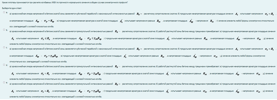 Какие гипотезы принимаются при расчете изгибаемых ЖБК по прочности нормального сечения в общем случае симметричного профиля?- а) криволинейная эпюра напряжений в бетоне сжатой зоны заменяется кубической параболой с максимальной интенсивностью равной Rb – расчетному сопротивлению сжатию; б) продольная ненапрягаемая арматура площадью сечения Aₛ испытывает напряжения σₛ = Rₛ , а напрягаемая площадью Aₛₚ - σₚ = Rₛₚ ; в) продольная ненапрягаемая арматура в сжатой зоне площадью A`ₛ испытывает напряжения равные Rsc , а напрягаемая площадью A`ₛₚ - напряжения Rsc ; г) сечение элемента любой формы симметрично относительно оси, совпадающей с силовой плоскостью изгиба.