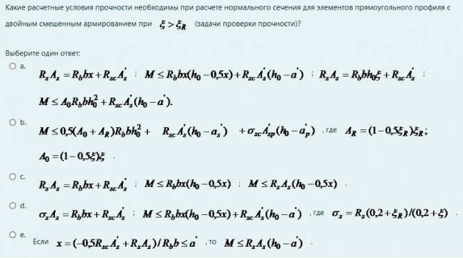Ответ на вопрос по строительству №740526: Какие расчетные условия прочности необходимы при расчете нормального сечения для элементов прямоугольного профиля с двойным смешенным армированием при ξ > ξR (задачи проверки прочности)? RsAs = Rb bx + RscA`s; M ≤ Rb bx (h₀ – 0,5x) + RscA`s (h₀ – a`); RsAs = Rb bh₀ξ + RscA`s; M ≤ A₀Rb bh₀² + RscA`s(h₀ – a`s). M ≤ 0,5 (A₀ + AR) Rb bh₀² + Rsc A`s (h₀ – a`s) + σscКакие расчетные условия прочности необходимы при - Ответ на вопрос по строительству №740526Какие расчетные условия прочности необходимы при - Ответ на вопрос по строительству №740526