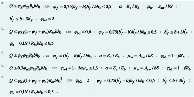 - Q ≤ φfφb1Rbbh₀, где φf = (b`f – b) h`f/bh₀; α = Es/Eb; μw = Asw/bS; φb1 = 1 – βRb.