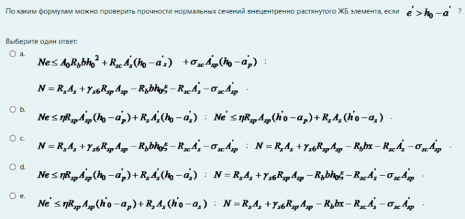 Ответ на вопрос по строительству №740627: По каким формулам можно проверить прочности нормальных сечений внецентренно растянутого ЖБ элемента, если e` > h₀ – a`? Ne ≤ A₀Rb bh₀² + RscA`ₛ(h₀ – a`ₛ) + σscA`ₛₚ(h₀ – a`ₚ) ; N = RₛAₛ + γₛ₆RₛₚAₛₚ – Rb bh₀ ξ – RscA`ₛ – σscA`ₛₚ Ne ≤ ηRₛₚA`ₛₚ(h`₀ – aₚ) + RₛA`ₛ(h₀ – a`ₛ) ; Ne` = ηRₛₚAₛₚ(h₀ – a`ₚ) + RₛAₛ(h`₀ – aₛ) . N = RₛAₛ + γₛ₆RₛₚAₛₚПо каким формулам можно проверить прочности - Ответ на вопрос по строительству №740627По каким формулам можно проверить прочности - Ответ на вопрос по строительству №740627