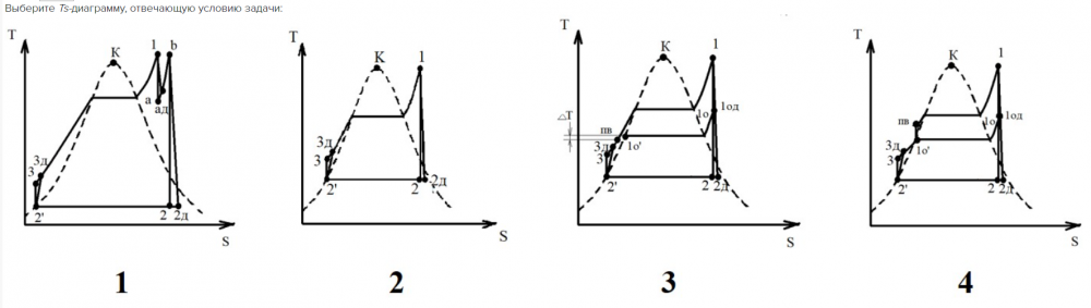 ПТУ мощностью 100 МВт работает на водяном паре при следующих параметрах: p1 = 13 МПа и t1 = 450 ℃ и p2 = 0,04 бар. Регенеративный подогрев питательной воды осуществляется за счет отбора пара в подогреватель поверхностного типа при p0 = 10 бар. Недогрев питательной воды до температуры насыщения греющего пара равен 4,8 ℃.Выберите Ts-диаграмму, отвечающую условию задачи: