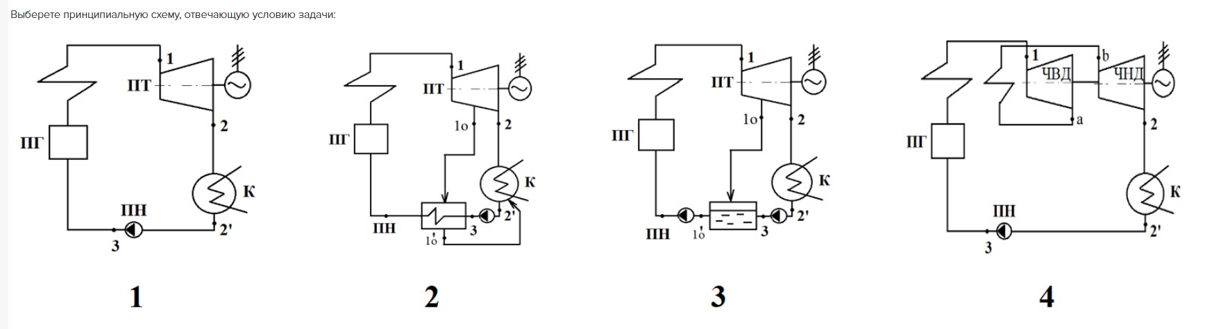 ПТУ работает на водяном паре с параметрами: p1 = 13,5 МПа и t1 = 590 ℃, p2 = 3,4 кПа. Мощность установки Nэ = 200 МВт. Определить внутренний и термический КПД цикла, часовой и удельный расход условного топлива, если ηтоi = 0,92; ηноi = 0,86; ηка = 0,9; ηм = 0,96; ηпп = 0,99; ηг = 0,98.Выберете принципиальную схему, отвечающую условию задачи: