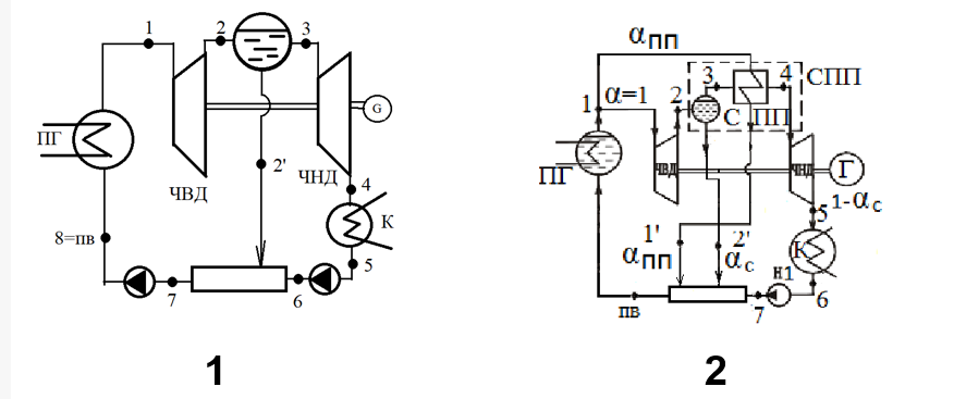 Рассчитать термический КПД цикла АЭС с сепаратором-пароперегревателем (СПП). Дано: p1 = 5,7 МПа, давление в СПП 1 МПа, в конденсаторе 3,8 кПа, температура промежуточного перегрева на 22,2 °C меньше, чем t1. Мощность турбины 300 МВт.Выберете принципиальную схему, отвечающую условию задачи: