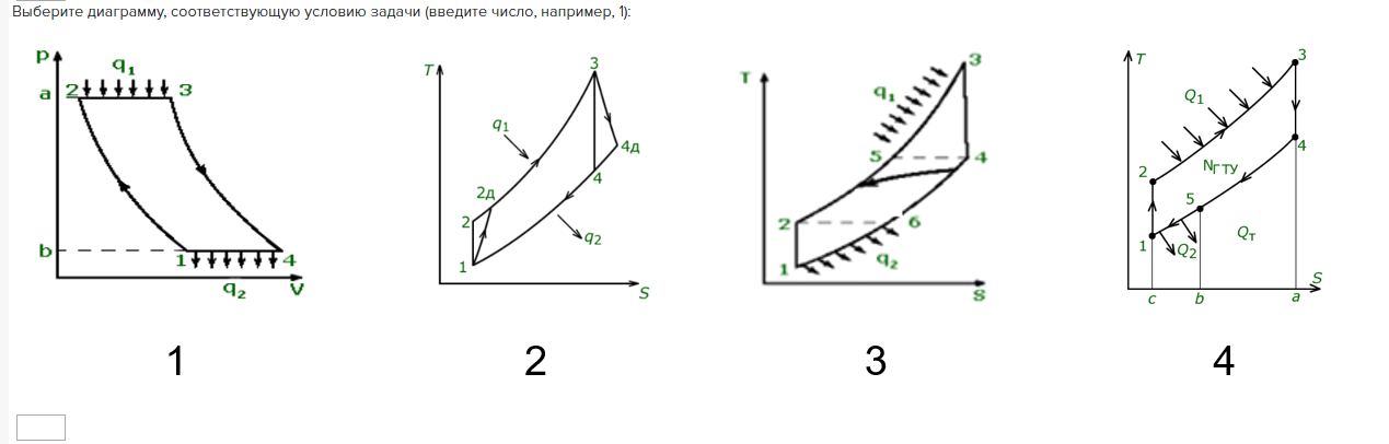 Параметры воздуха на входе в компрессор ГТУ-ТЭЦ: р = 0,1 МПа и t = 8 °С, давление в камере сгорания 0,78 МПа, температура газа перед газовой турбиной 780 °С, внутренний относительный КПД компрессора 0,81, турбины 0,9.Выберите диаграмму, соответствующую условию задачи (введите число, например, 1):