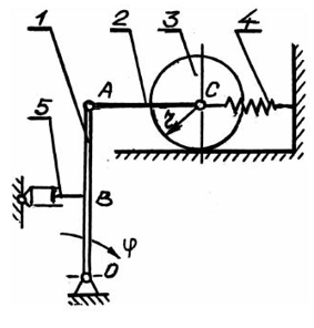 жесткость пружины 4: с=600 Н/м, ОВ=АB=2г=0.5 м, коэффициент сопротивления демпфера 5: μ=500 Н•с/м