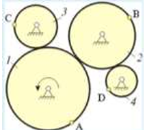 Зубчатые колеса 1, 2, 3 и 4, находящиеся в зацеплении, имеют неподвижные оси вращения. Радиусы колёс удовлетворяют соотношению: R1 > R2 > R3 > R4. Какая из точек A, B, C или D имеет наибольшее вращательное ускорение?