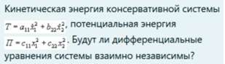 Кинетическая энергия консервативной системы T = a₁₁x`₁² + a₂₂x`₂², потенциальная энергия П = c₁₁x₁² + c₂₂x₂². Будут ли дифференциальные уравнения системы взаимно независимы?
