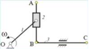 От кривошипа 1 с помощью ползуна 2 приводится в движении кулиса 3. Каково соотношение между величинами скоростей точек А, В и С?