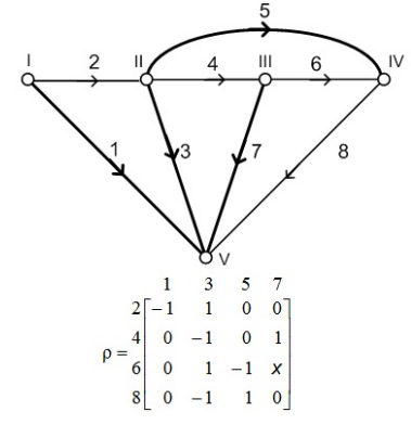 Для приведенного варианта выбора покрывающего дерева графа укажите значение элемента матрицы главных циклов для ребер дерева, отмеченного символом ''x''.