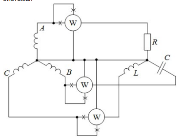 Для представленной цепи задано: действующее значение линейных напряжений 380 В; R=ХL=ХС=110 Ом. Ваттметры включены по схеме измерения активной мощности всей трехфазной системы. Определите активную мощность трехфазной системы (то есть сумму показаний всех ваттметров). Ответ дайте в ваттах с точностью до целого значения