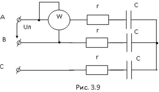 Дано: Uл=380 В; r=50 Ом; Xc=30 Ом. Определить показания ваттметра в цепи.