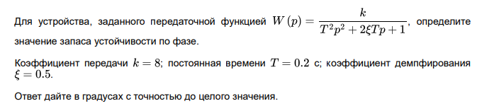 Для устройства, заданного передаточной функцией , определите значение запаса устойчивости по фазе. Коэффициент передачи ; постоянная времени c; коэффициент демпфирования . Ответ дайте в градусах с точностью до целого значения.Ответ