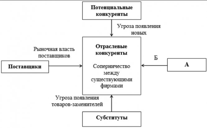На рисунке показана схема пяти конкурентных сил по М. Портеру. Определите, какая конкурентная сила обозначена буквой «А»? Какое влияние обозначено буквой «Б»?