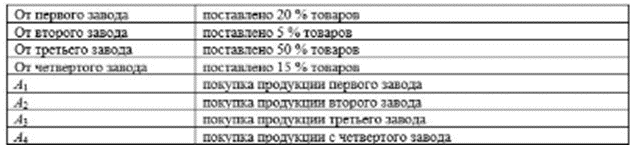 Расположите в порядке возрастания вероятности P(A₁), P(A₂), P(A₃), P(A₄), если известно, каким заводом поставлено какое число товаров на склад в процентном отношении от общего их количества на складе, а также описаны события A₁ A₂ А₃ А₄ (см. таблицу ниже):