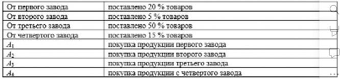 Расположите в порядке возрастания вероятности P(A₁), P(A₂), P(A₃), P(A₄), если известно, каким заводом поставлено какое число товаров на склад в процентном отношении от общего их количества на складе, а также описаны события A₁ A₂ А₃ А₄ (см. таблицу ниже):- 1 P(A₂)