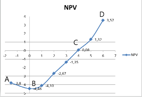 Ниже приведен график чистой приведенной стоимости проекта NPV.В какой точке графика наступает окупаемость проекта?