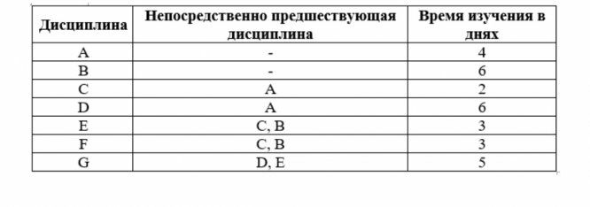 Ответ на вопрос №737631: Ниже приведена таблица с планом изучения дисциплин и временем их изучения (в днях). По данным таблицы определите критический путь. Критический путь: A-D-G Критический путь: B-E-G Критический путь: A-C-F Критический путь: A-C-E-G Ниже приведена таблица с планом изучения дисциплин и временем их - Ответ на вопрос №737631Ниже приведена таблица с планом изучения дисциплин и временем их - Ответ на вопрос №737631