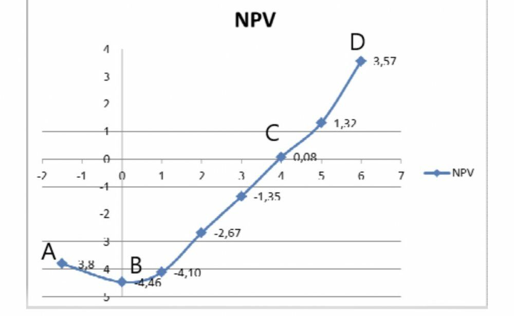 Ниже приведен график чистой приведенной стоимости проекта NPV.В какой точке графика наступает окупаемость проекта?