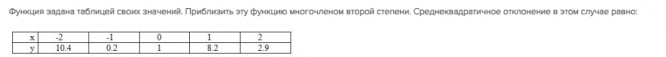 Ответ на вопрос №12956: Функция задана таблицей своих значений. Приблизить эту функцию многочленом второй степени. Среднеквадратичное отклонение в этом случае равно: X -2 -1 0 1 2 Y 10.4 0.2 1 8.2 2.9 0.013 1.17 3.41 0.12 Функция задана таблицей своих значений. Приблизить эту функцию - Ответ на вопрос №12956Функция задана таблицей своих значений. Приблизить эту функцию - Ответ на вопрос №12956