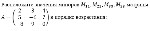 Расположите значения миноров М11, М22, М33, М23 матрицы А= 2 3 4 5 -6 7 -8 9 0