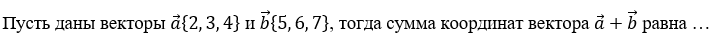 Ответ на вопрос №149259: Пусть даны векторы a{2, 3, 4} и b{5, 6, 7}, тогда сумма координат вектора a+b равна ...Пусть даны векторы a{2, 3, 4} и b{5, 6, 7}, тогда сумма координат - Ответ на вопрос №149259Пусть даны векторы a{2, 3, 4} и b{5, 6, 7}, тогда сумма координат - Ответ на вопрос №149259