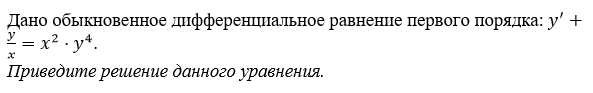 Дано обыкновенное дифференциальное уравнение первого порядка: y'+y/x=x2*y4. Приведите решение данного уравнения
