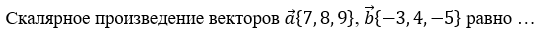 Скалярное произведение векторов a{7, 8, 9}, b{-3, 4, -5} равно ...