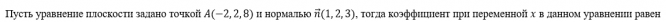 Пусть уравнение плоскости задано точкой A(−2, 2, 8) и нормалью n(1, 2, 3), тогда коэффициент при переменной x в данном уравнении равен