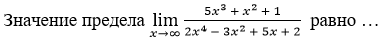 Значение предела lim (5x³ + x² + 1) / (2x⁴ − 3x² + 5x + 2), x⟶∞ равно …