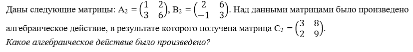 Даны следующие матрицы: А2 = (1, 2, 3, 6), B2 = (2, 6, -1, 3). Над данными матрицами было произведено алгебраическое действие, в результате которого получена матрица С2 = (3, 8, 2, 9). Какое алгебраическое действие было произведено?