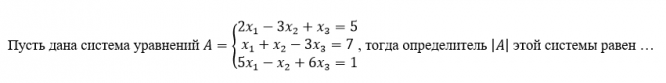Пусть дана система уравнений A = {2x₁ − 3x₂ + x₃ = 5, x₁ + x₂ − 3x₃ = 7, 5x₁ − x₂ + 6x₃ = 1, тогда определитель |A| этой системы равен …