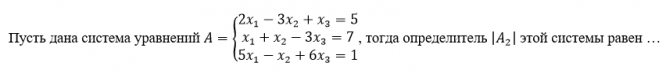 Ответ на вопрос №303118: Пусть дана система уравнений A = {2x₁ − 3x₂ + x₃ = 5, x₁ + x₂ − 3x₃ = 7, 5x₁ − x₂ + 6x₃ = 1, тогда определитель |A₂| этой системы равен … Пусть дана система уравнений A = {2x₁ − 3x₂ + x₃ = 5, x₁ + x₂ − 3x₃ - Ответ на вопрос №303118Пусть дана система уравнений A = {2x₁ − 3x₂ + x₃ = 5, x₁ + x₂ − 3x₃ - Ответ на вопрос №303118