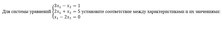 Дана система уравнений {3x1-x2=1, 2x1+x2=5, x1-2x2=0, установите соответствие между характеристиками и их значениями:- A. Ранг основной матрицы