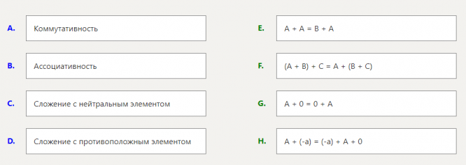 Ответ на вопрос №309186: Установите соответствие между свойствами сложения матриц А и В и их записями: A. Коммутативность B. Ассоциативность C. Сложение с нейтральным элементом D. Сложение с противоположным элементом E. А + А = В + А F. (А + В) + С = А + (В + С) G. А + 0 = 0 + А H. А + (-а) = (-а) + А + 0 Установите соответствие между свойствами сложения матриц А и В и их - Ответ на вопрос №309186Установите соответствие между свойствами сложения матриц А и В и их - Ответ на вопрос №309186