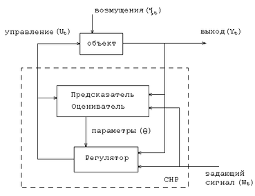 Рассматривается одноканальный СНР, имеющий скалярный вход и выход (т. е. Y и U – скалярные величины). Параметры регулятора (вектор ) зависят от коэффициентов модели объектов, а так как модель неизвестна, то для определения используется оцениватель, позволяющий сформировать оценку по наблюдению входа Ut, выхода Yt объекта и значению задающего сигнала Wt. Предсказатель служит для учета задержки при управлении. Рассматриваемый регулятор относится к классу оптимальных адаптивных регуляторов и формирует управляющее воздействие на объект оптимальное в смысле какого-либо выбранного критерия.