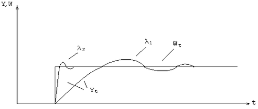 Как видно из рисунка, при уменьшении уменьшается дисперсия ошибки управления M{(Y – W)2} и увеличивается мощность управления, при этом возрастает дисперсия ошибки. Ограничение на управление влияет на переходной процесс (рис. 3).