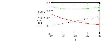 Hа рисунке 4 показаны расчетные зависимости дисперсии суммарной ошибки e2 и ее составляющих ex2 и eп2 от величины коэффициента усиления корректирующего устройства k1. Для удобства на рисунке 4 дисперсия ошибки относительно сигнала обозначена через dex(k), дисперсия ошибки из-за действия помехи через den(k), а дисперсия суммарной ошибки через den(k).