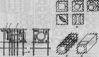 В период транзисторной техники возникло новое направление в конструировании РЭС — миниатюризация аппаратуры. Уменьшились размеры и массы пассивных ЭРЭ, транзисторов и трансформаторов, катушек индуктивностей и даже электронно-лучевых трубок. Появились новые конструкции функциональных узлов: плоские и объемные модули (рис. В.4),плоские и этажерочные микромодули (рис. В. 5), отличающиеся оригинальностью конструкций и монтажа и увеличением плотности упаковки элементов в объеме с 0,1 эл/см3 до 1,5...2 эл/см3 . Однако сохранение за дискретными ЭРЭ главной роли основного конструктивного элемента с частотой отказов = 10-6 ч-1 не смогло существенно повлиять на надежность РЭС, и при все более увеличивающейся их