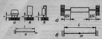 элемента по варианту П. Расчетными моделями данной конструкции могут служить: балка с шарнирным или жестким закреплением на концах (рис. 4.9, б,в) и рама (рис. 4.9, г). Длины балки и горизонтальной связи рамы l определяются длиной выводов радиоэлемента от корпуса до изгиба. Корпус элемента моде-