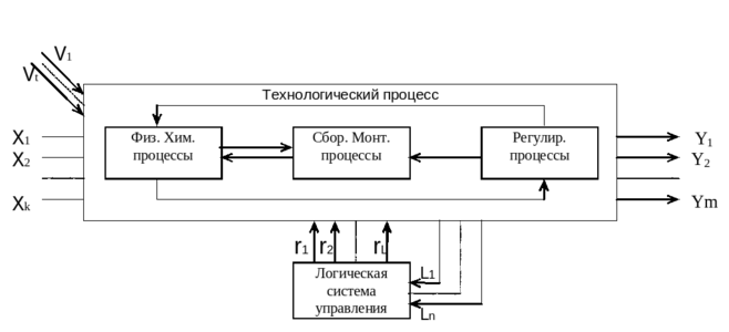 Логическая система управления служит для генерации управляющих сигналов (r1…rL), которые изменяют характеристики производственного процесса таким образом, что достигается конечная цель этого процесса. Примером логической системы управления могут служить сами технологи, либо система управления - директор, главный инженер, главный технолог и т.д.