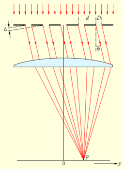 В фокальной плоскости линзы расстояние ym от максимума m = 0 максимума m-го порядка при малых углах дифракции равно,