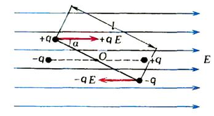 На помещенный в электрическое поле диполь действуют две силы, равные по модулю и противоположные по направлению (|F|=qE). Так как они приложены к разным концам диполя, который схематично представляет собой два разноименных заряда q, соединенных на расстоянии l друг с другом, создается вращательный момент M=2qE*