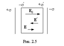 ри попадании диэлектрика в электрическое поле (создается заряженными плоскостями с поверхностной плотностью зарядов σ) происходит его поляризация. При этом на его гранях появляются связанные заряды σ’. Поверхностная плотность связанных зарядов меньше, чем плотность свободных. Результирующее поле внутри диэлектрика E=E0 – E’=(σ – σ’)/ε0.