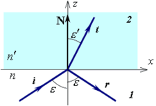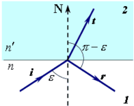 После прохождения границы раздела двух сред падающая плоская волна (луч i) разделяется на две волны: проходящую во вторую среду (луч t) и отраженную (луч r) Угол падения